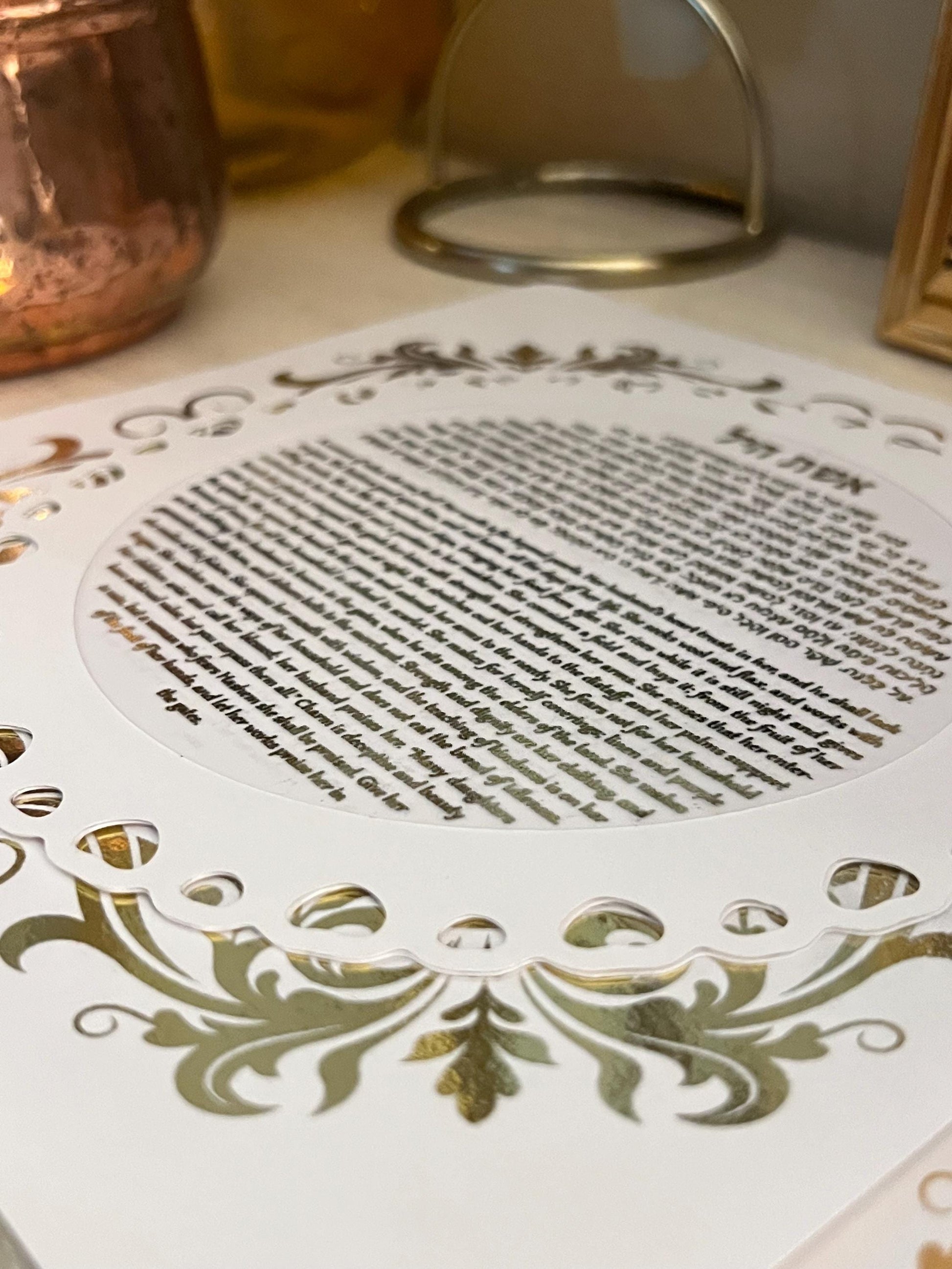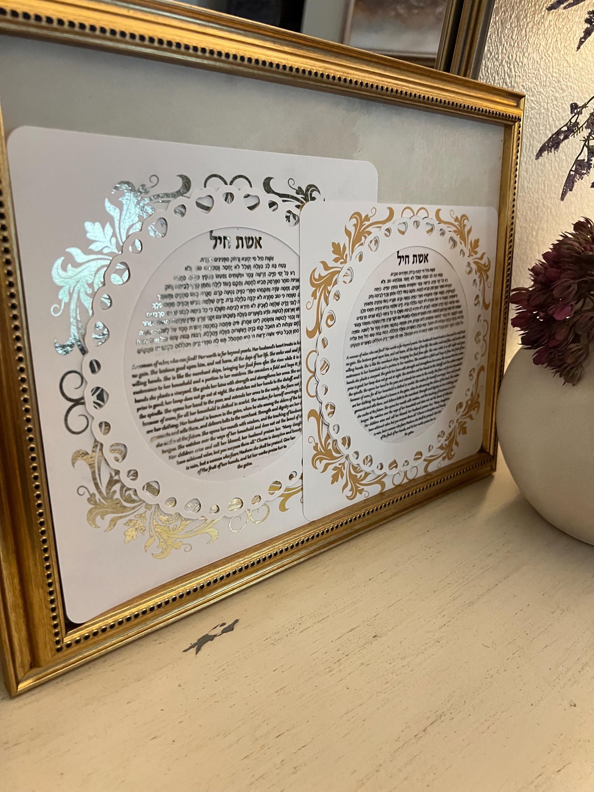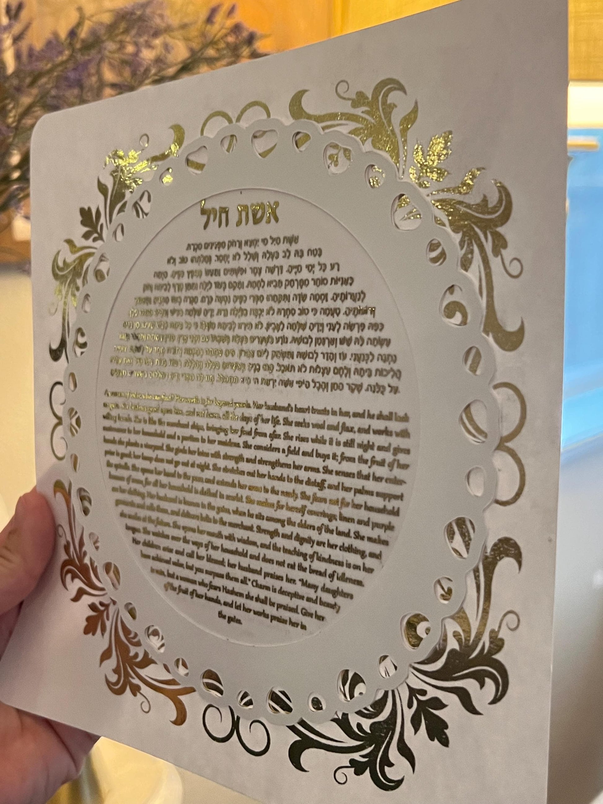 Bring beauty, elegance, and holiness into your home with this stunning Eshet Chayil (אשת חיל) decorative art piece.