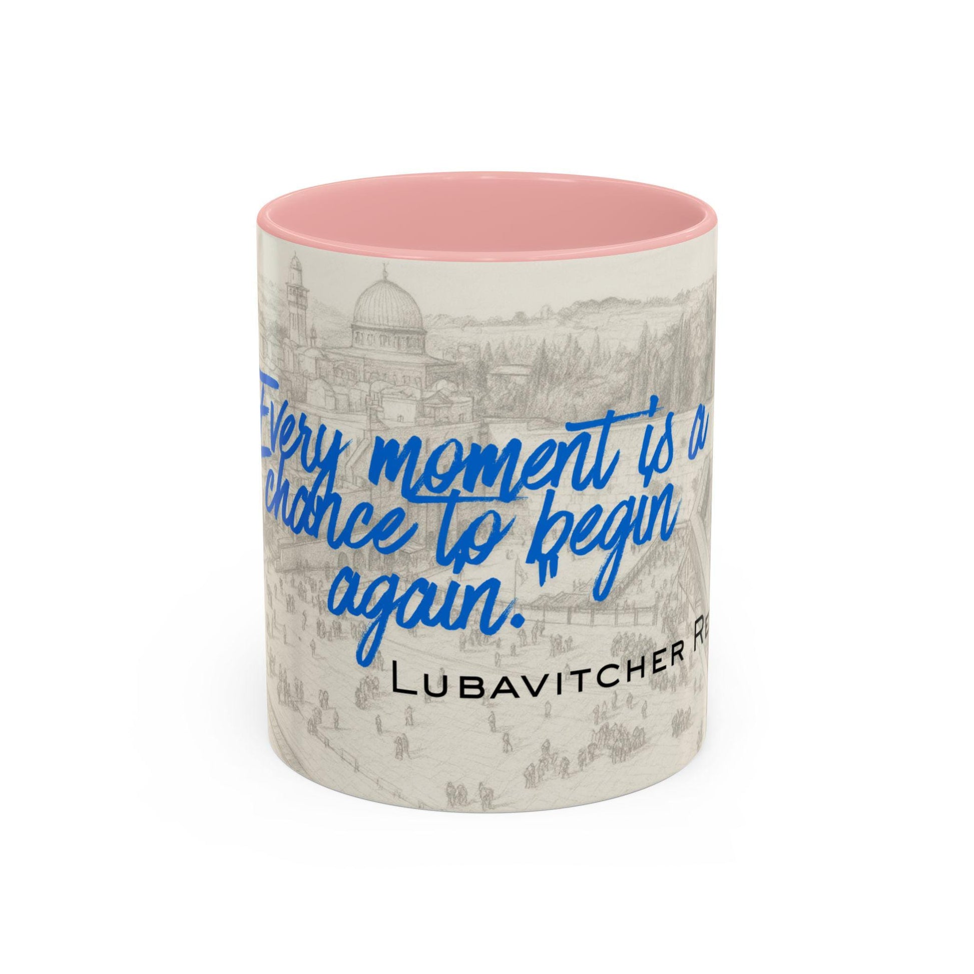 Warm ceramic mug with a gentle, reflective design that invites a pause in the day. Soft, sepia-toned illustration wraps around the white body while a bold, hand-lettered blue phrase rests on top — a quiet reminder that each moment brings a new beginning. The colored interior and handle add a cheerful contrast to the muted artwork, making the mug both comforting and visually engaging. It feels like the kind of mug you reach for during morning coffee, late-night journaling, or when you need a small ritual to steady your thoughts. Dishwasher- and microwave-safe, with a glossy finish and a comfortable C-shaped handle, this mug blends everyday practicality with a gentle, meaningful presence.
